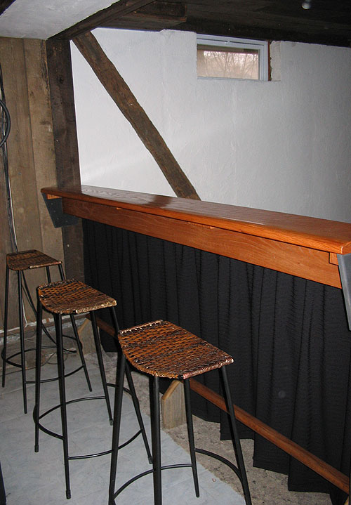 After mounting the top I added a curtain to the rear of the bar to help further divide the room. Using a length of staircase banister I made a footrest. Add a few bar stools & we're in business.