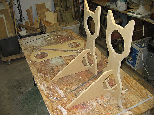 I needed to build some stands. I mocked up an unnecessarily complicated design on my computer, cut the parts, assembled, primed & painted a pair. The design was inspired by the angular face plate of the speakers & was intended to complement them. They ended up looking a little "out there" but I wanted something wild. After all this work I couldn't just sit my speakers on a couple of milk crates. Something special was needed. Here's the stands mid assembly.