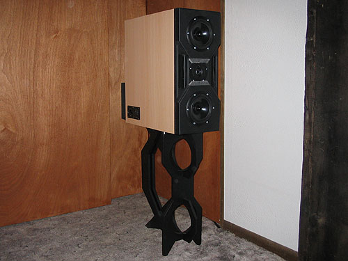Here's the finished speaker atop its stand. The pair sit one each side of my HDTV. As a first attempt I'm quite pleased with the sound. They're distortion free up to house shaking volumes & the ports pump out bass that you can really feel. That being said, compared to most home theater speakers they seem to lack energy or punch. I'm not sure exactly what the problem is but as a first attempt & a great learning experience I'm happy.