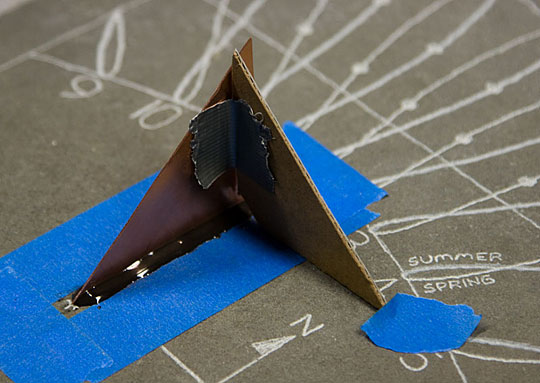 Using five minute epoxy & a cardboard right angle I glued the gnomon to the stone. The gnomon was cut from a scrap piece of copper plate.