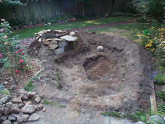 Once the main pond was excavated I set about creating the smaller upper pond. Using cinder blocks, rocks & dirt I created a round basin.