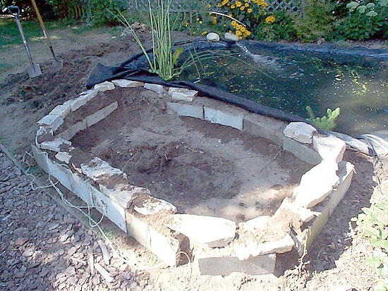 After tarring down my original flimsy upper pond, I created this larger stronger structure. You can see I left a section of the wall slightly lower than the rest. This is where the water fall will go.