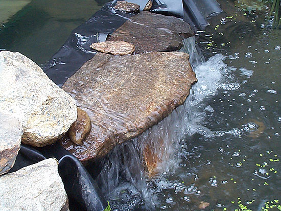 Most of the water was passing under the stones instead of over them so we added a strip of liner temporally to fix the problem. Once the waterfall design is finalized we'll be sealing the rock with concrete & expanding foam.