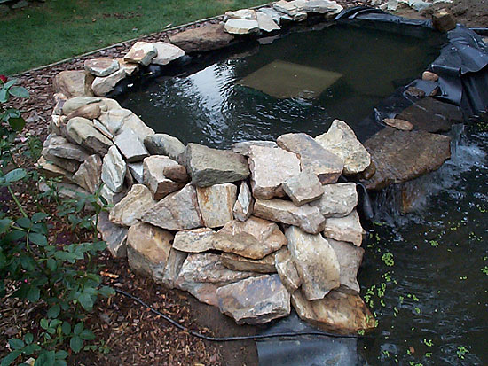 Here's another angle showing the stone work in progress. The flat rocks we were using for the waterfall were a tad too thick & were making the water level in the upper pond dangerously high.