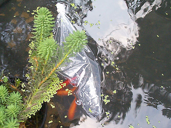 To help get the beneficial bacteria in the water going & to encourage a self sustaining eco-system we added three small goldfish. Here they are getting used to the pond's temperature still in their store bag.