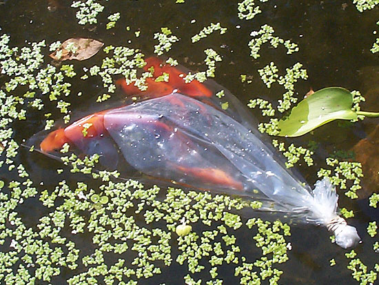 Here's the new fish getting used to the pond's temperature. This addition brings the pond's total fish up to eight.