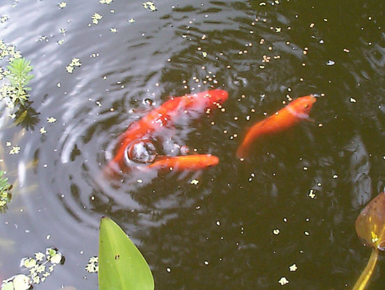 The new fish seemed to get along fine with the older ones. They immediately formed a school & cruised around together exploring their new home. Here's the older fish showing the newer ones where the food can be found.