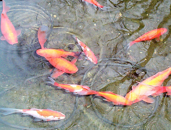 Having originally stocked the pond with a handful of plain gold coloured fish we were pleasantly surprised to find some of their offspring with cool white colouring.