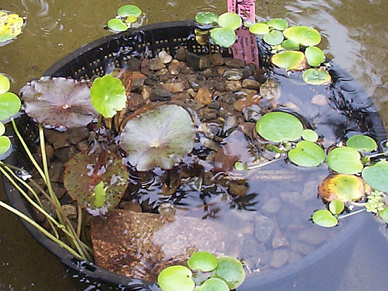 Our Water Lilly bulb began to produce leaves (red/green leaves) almost as soon as it was potted. Although still quite small we're hoping these will eventually cover a large area of the pond's surface.