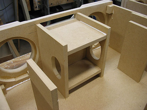 Internal bracing is added to help keep the enclosure rock solid & vibration free. In this view you can see how the innovative tweeter enclosure integrates with the two bass port slots. I'm not sure what purpose the two holes in this structure serve but they were in Tom Gee's schematic so I cut them just to be safe.