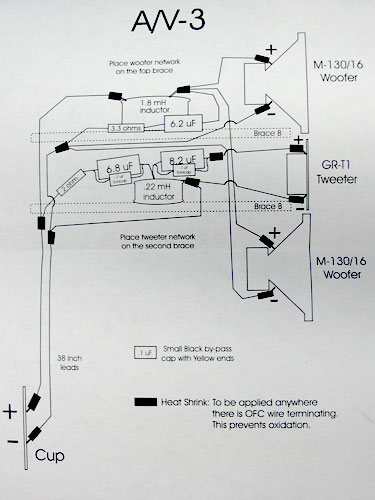 I did a lot of research into crossover design, played around with several software programs & now have a fairly good understanding of how it all works. This being my first high end speaker building project I felt it was best to leave this part of the design to the experts. So I ordered two assembled crossover networks from GR Research. These were tailored to their A/V-3 MTM speaker which uses the same tweeter & woofers I'm using here. The A/V-3 has virtually the same driver layout as the Proteus, with only slightly different spacing & position. Although the crossover network was calibrated precisely for the A/V-3 I figured they would be close enough for my purposes. I could always tweak it later if needed.